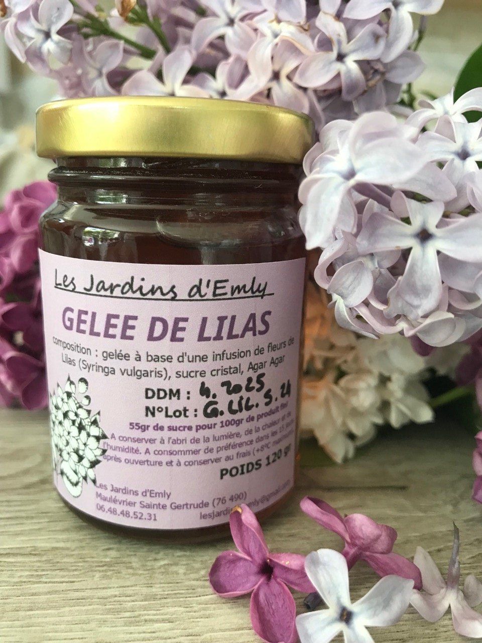 composition : infusion de fleurs de lilas porté en gelée, sucre cristal, eau et Agar Agar. Taux de sucre 55%.