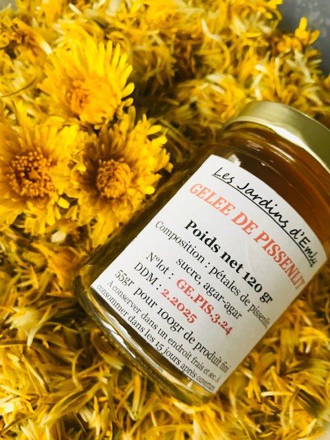 Gelée de Pissenlit appelée 'Cramaillotte' au goût floral inégalable. Composée de l'infusion des pétales de pissenlit (Taraxacum officinales), de sucre cristal et d'agir-Agar. Teneur en sucre de 55%.
