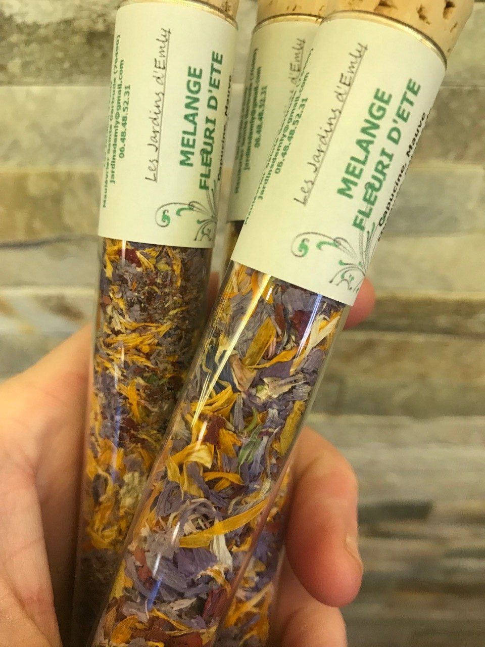 Mélange de fleurs comestibles conditionnée dans un tube d'essai en verre refermé de son bouchon de liège, dont la capacité est de 5gr.