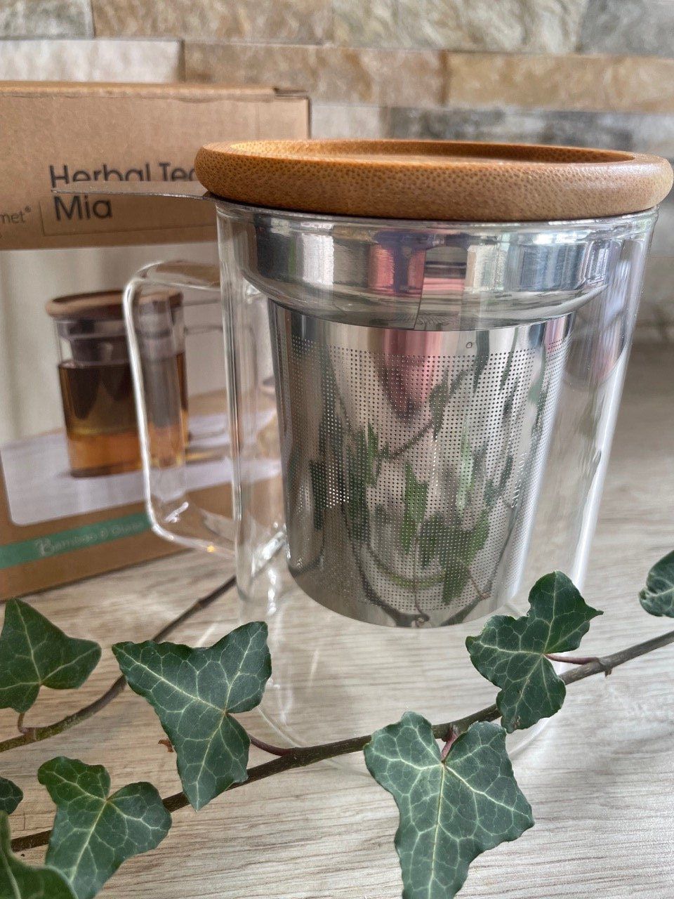 TISANIÈRE EN VERRE MONOPAROI AVEC SON FILTRE EN INOX ET SON COUVERCLE EN BAMBOU